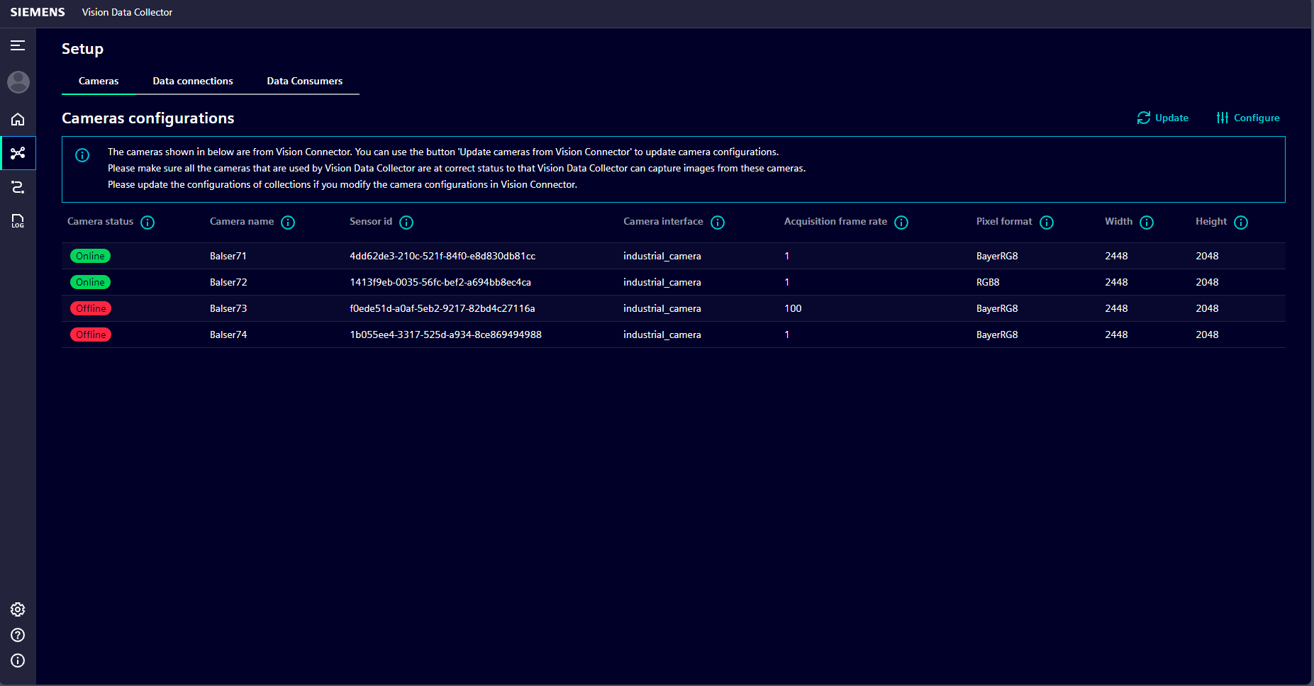 Vision Data Collector is a Siemens Industrial Edge App which captures images from Vision Connector, inference results from AI Inference Server, and stores them on a file server. You can use the captured data to (re)train and diagnose AI models.