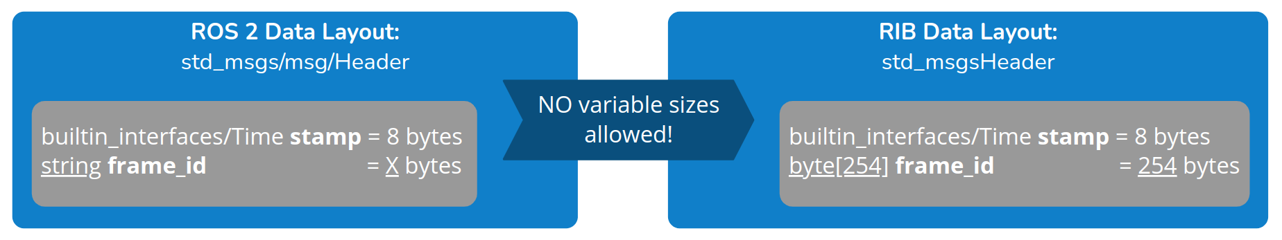 Therefore, ROS 2 message types that contain strings e.g. string frame_id in std_msgs/msg/Header will translate those strings to a fixed size byte array with the size of 254 bytes (as shown in the picture below).