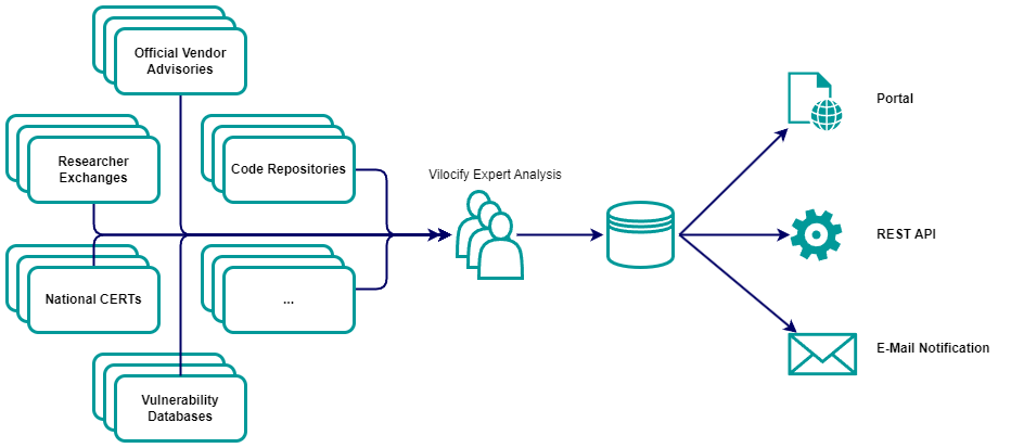 Vilocify alerts you about vulnerabilities affecting software and hardware utilized in your products and infrastructure. Our unique monitoring approach ensures that you receive the relevant information based on your individual selection of third-party components. We achieve this by monitoring thousands of security sources using advanced technologies like natural language processing (NLP) in combination with in-depth analysis by acknowledged cybersecurity experts. Whenever relevant information is detected, it's analyzed and evaluated by our dedicated team. The processed information is then made available through the Vilocify Portal, the REST-API, and email notifications.